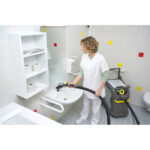 Alliant l’efficacité de la vapeur à l’aspiration eau et poussières, le SGV 6/5 est un concentré d’efficacité. Avec 6 bar de pression et une température de 100°C, il décolle efficacement les salissures les plus tenaces. Facilement accessibles, les réservoirs d’eau propre et d’eau sale d’une capacité de 5 litres chacun, offrent un excellent confort pour un remplissage et un vidage faciles. Le guidon de transport et les grandes roues lui confèrent une mobilité dans les escaliers et le franchissement des obstacles. Ergonomique, le réglage de l’intensité de vapeur ainsi que de l’interrupteur on/off de l’aspiration se fait directement à la poignée. Une caissette de rangement amovible permet d’accèder facilement aux accessoires. Grâce aux alvéoles d’aération sur le capot, les accessoires se rangent directement, sans être séchés, après utilisation. Les trois brosses (laiton, acier inoxydable,Pékalon) viendront à bout des saletés tenaces et la buse jet crayon sera parfaite pour les joints et endroits difficiles d’accès. Avec la buse triangulaire (en option), les endroits difficilement accessibles comme les coins et les angles peuvent être nettoyés efficacement.